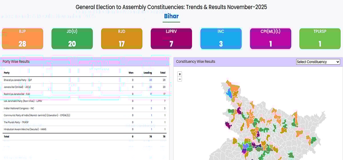 تازہ ترین صورت حال: این ڈی اے 38 نشستوں پر آگے — بی جے پی 20، جے ڈی یو 15، ایل جے پی (آر وی) 3 سیٹ پر آگے۔