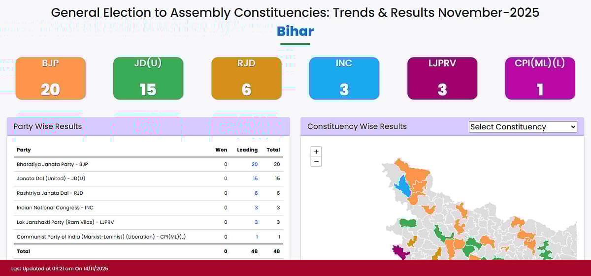 این ڈی اے 111 نشستوں پر آگے — بی جے پی 48، جے ڈی یو 47، ایل جے پی (آر وی) 13، ایچ اے ایم ایس 3